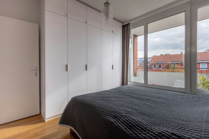 В спальне выбирают вместительный вариант и гармоничный с интерьером. Матовые фасады, скрытые ручки и нейтральные оттенки создают спокойный визуальный эффект, который не перегружает пространство.