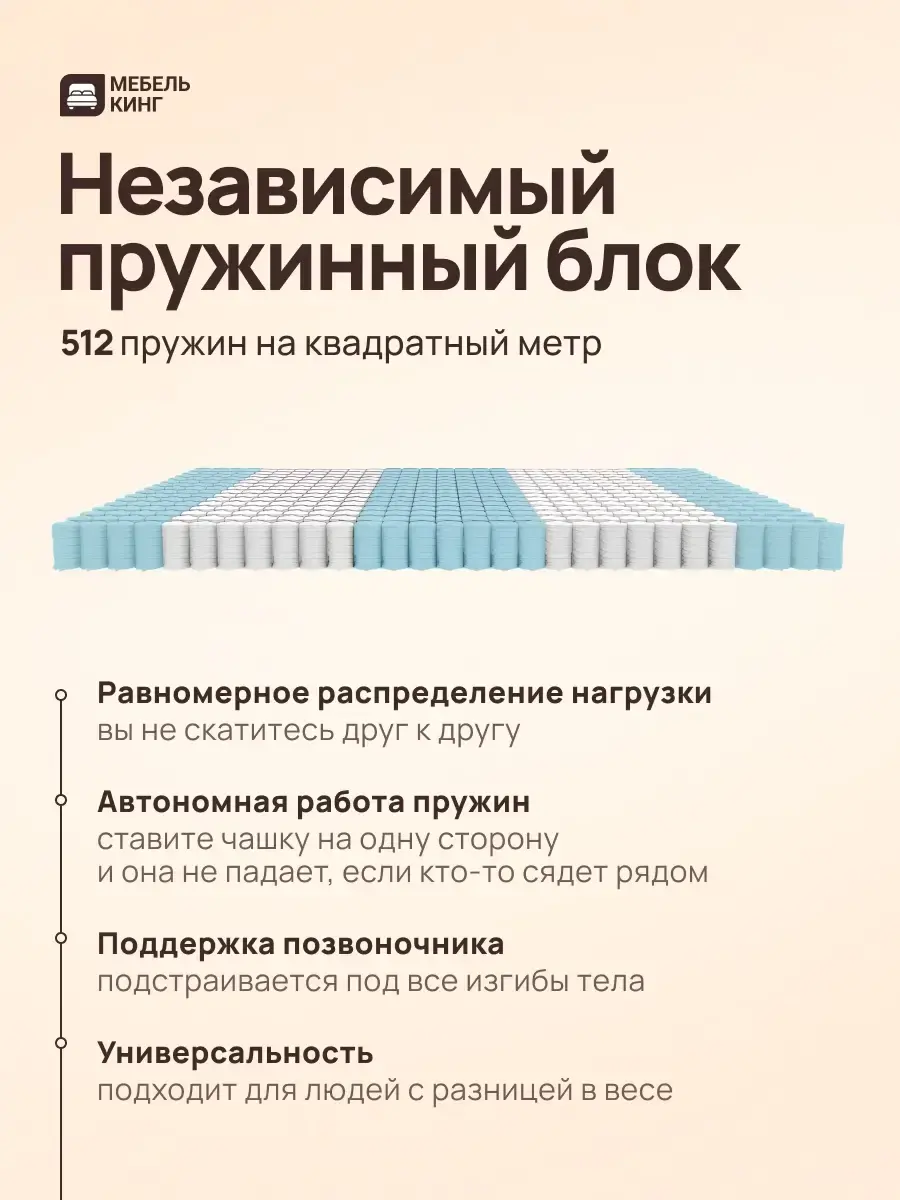 Главная особенность модели – блок независимых пружин. Благодаря независимой поддержке позвоночник во время сна находится в анатомически правильном положении, что улучшает качество сна и общее самочувствие утром.