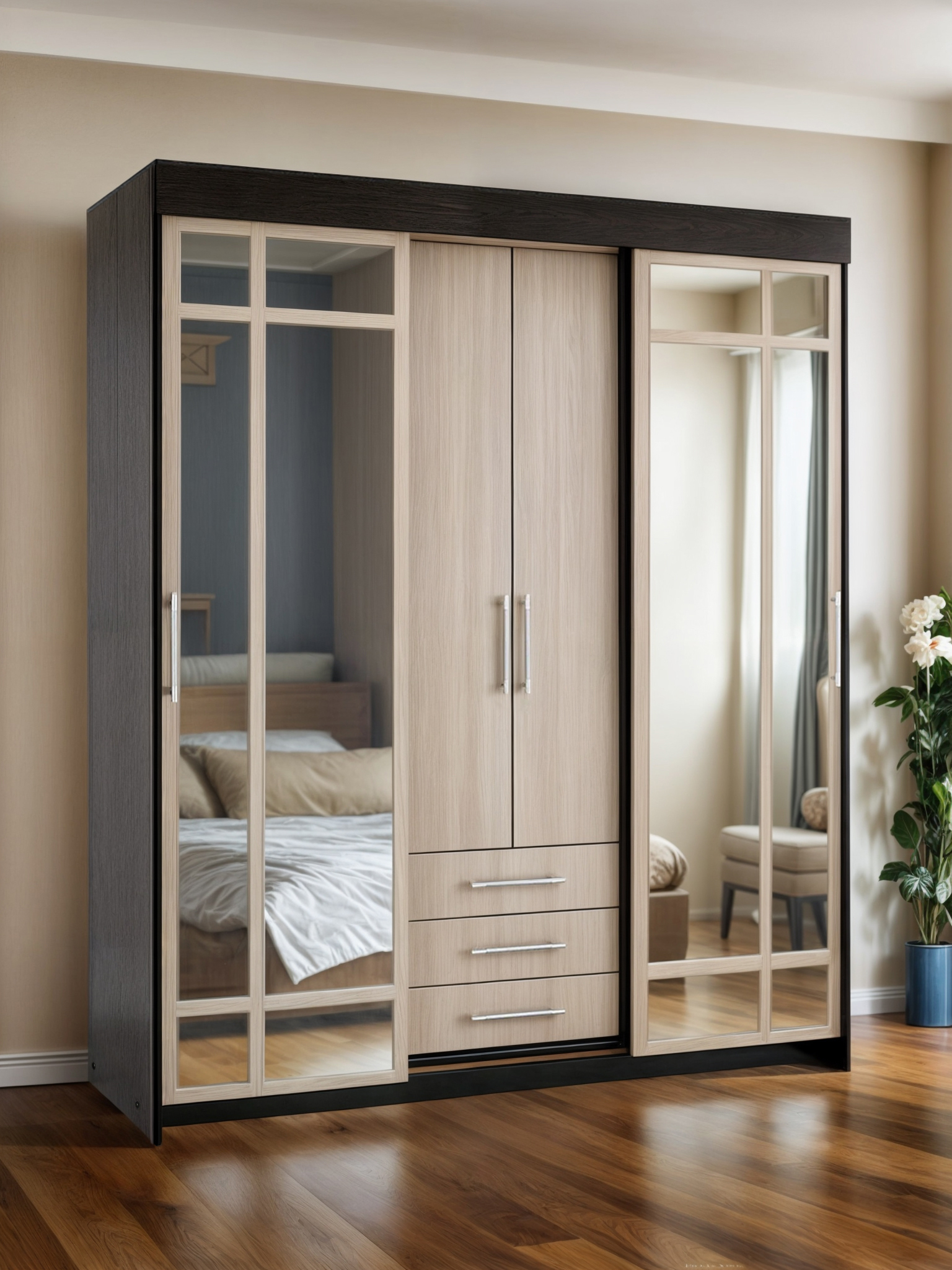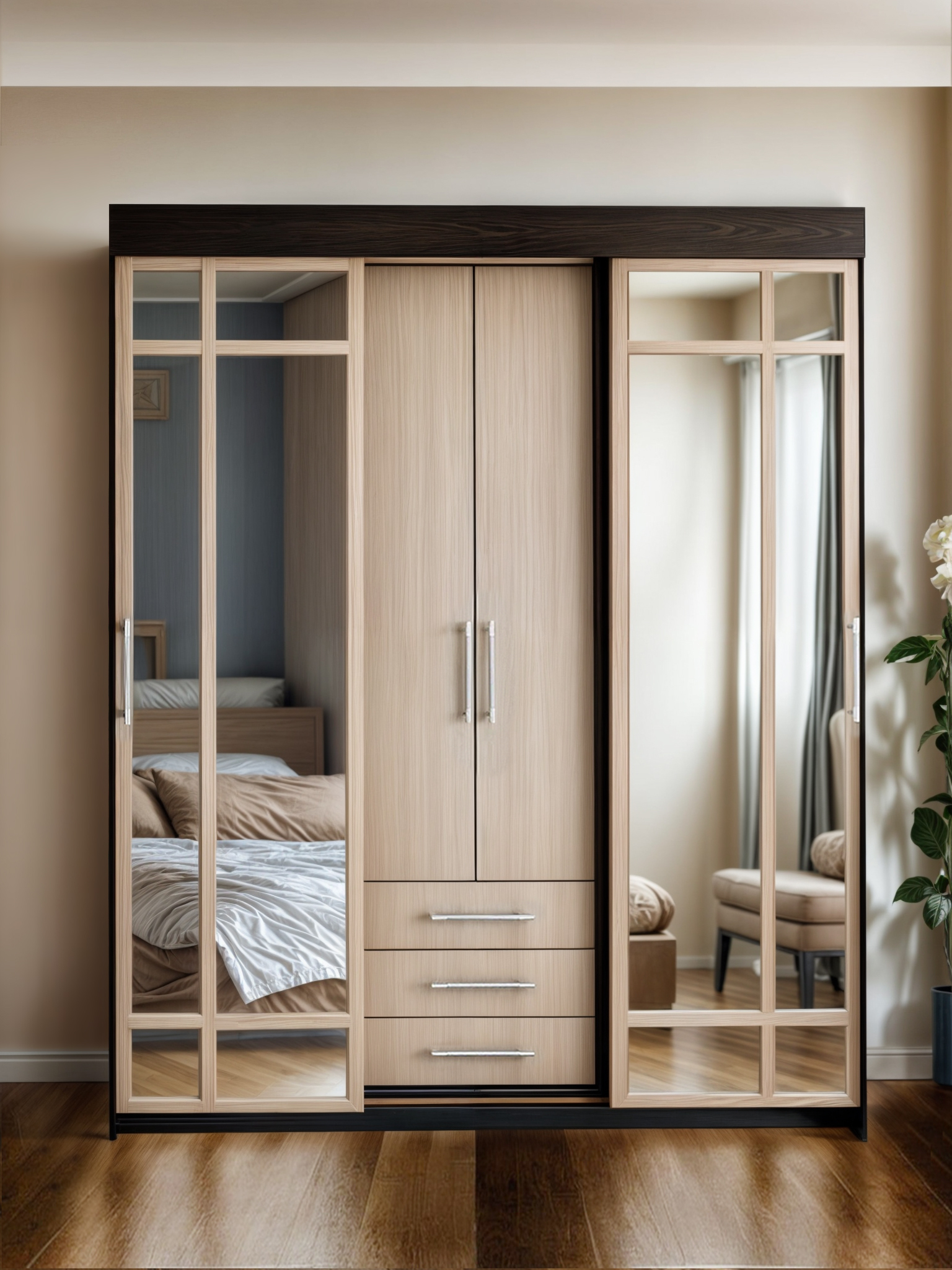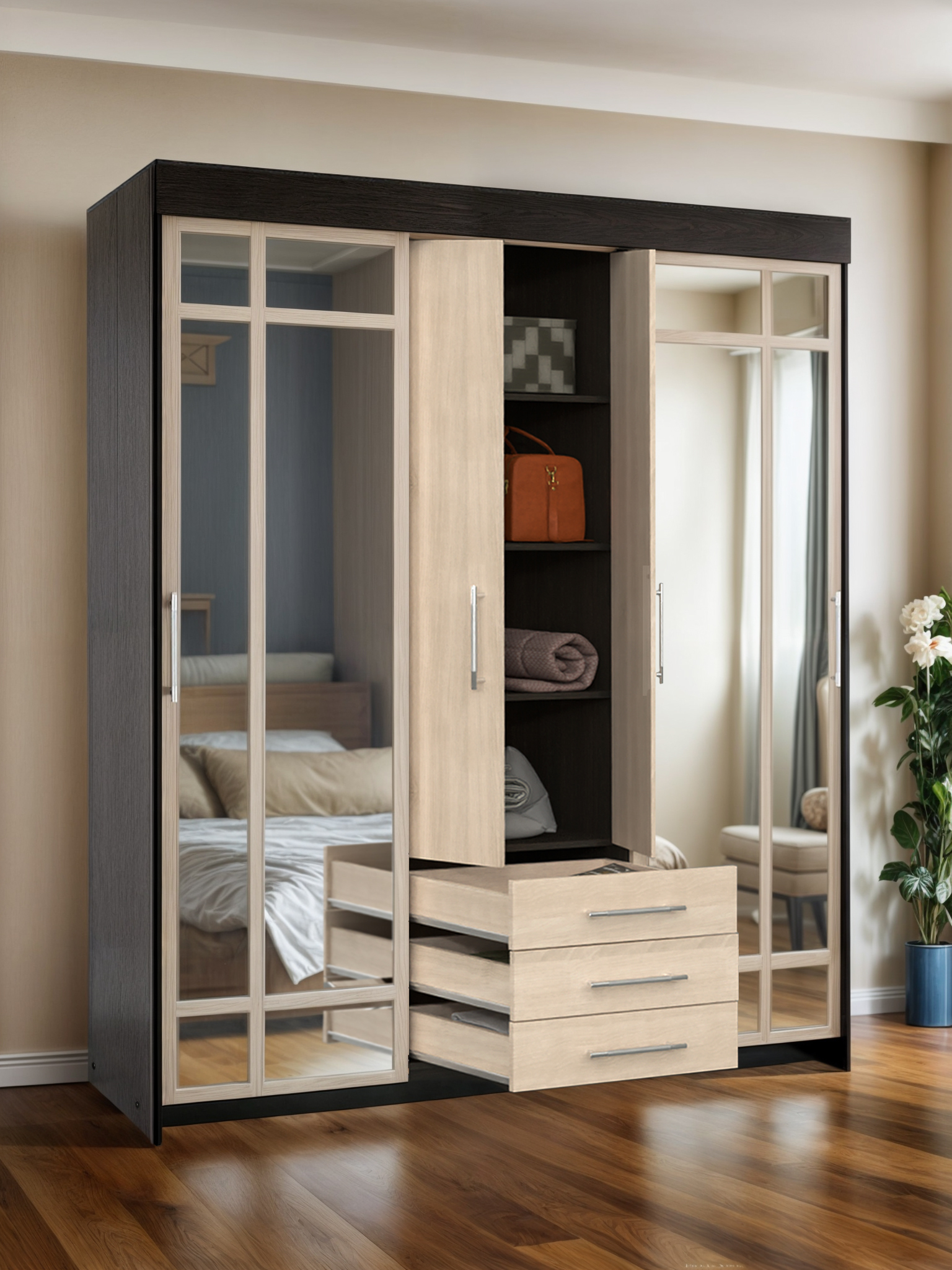Шкаф купе Маэстро - практичное решение для вашей спальни. Выдвижные ящики, штанги для вешалок и полки помогут компактно разместить все ваши вещи.